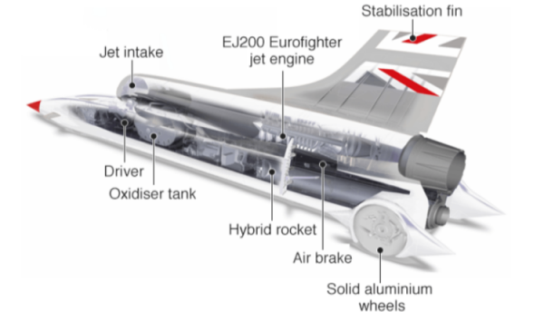 Bloodhound развил скорость свыше 1010 км/ч всего с одним реактивным двигателем. В машине установлен реактивный двигатель Eurojet EJ200, который используется в истребителе Eurofighter Typhoon.